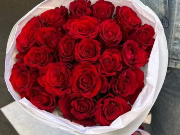 A classic bouquet of 21 fresh red roses wrapped in elegant paper. Stylish and timeless, it is the perfect gift to express love, admiration, and passion.